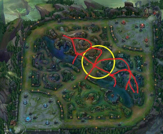 위에 그림을 보시면 미드 포탑을 밀게 되면 양쪽 길로 인해 시야 장악, 탑 봇 용 바론 로밍이 상대방보다