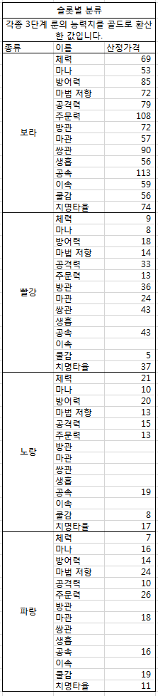 아래 이미지는 3단계 룬 중에 가격계산이 가능한 것들을 골라 수치를 돈으로 환산한 겁니다.