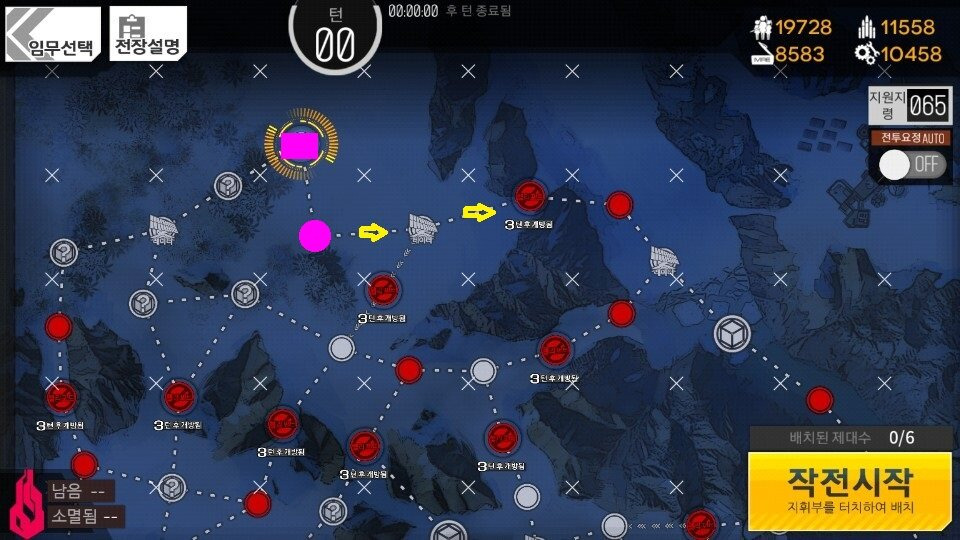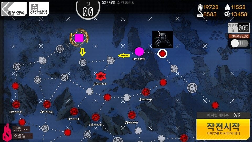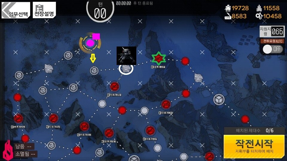 4턴 턴종 후 5턴 시작할 때 흰 동그라미 부분에 그림과 같은 [철혈 전투병]이 보인다면 오른쪽 별에 약화포탑이 없으므로 바로 작전종료 합니다.
