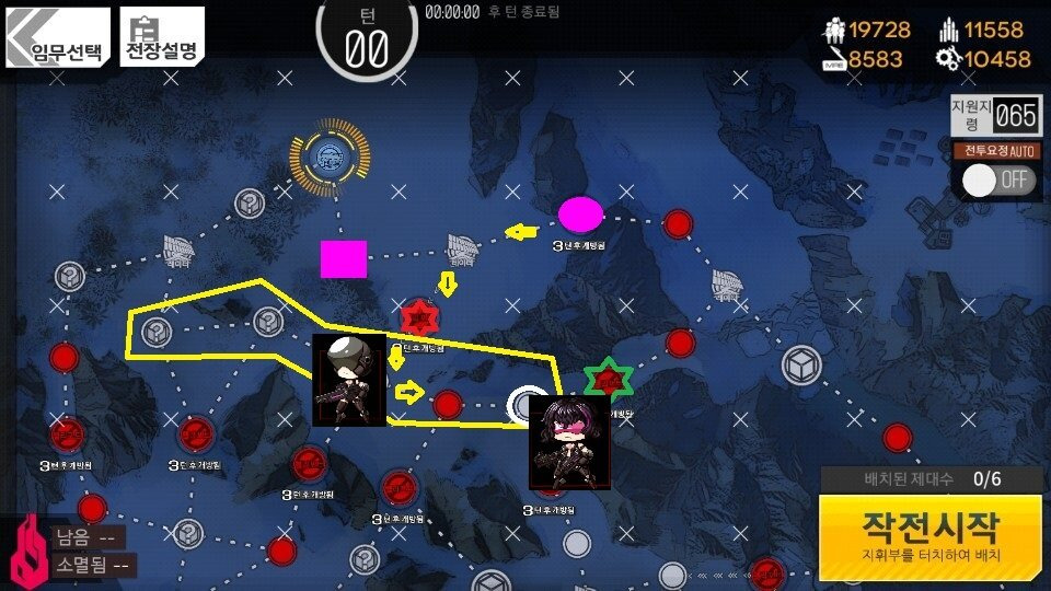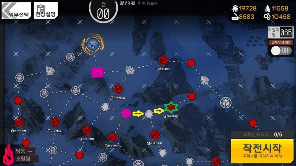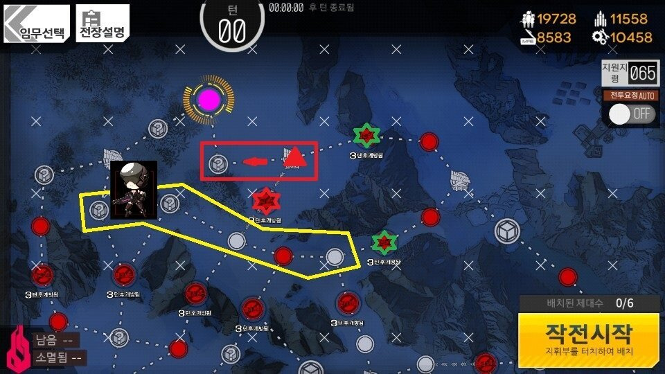 (3턴 시작시 그림의 흰 동그라미 부분에 귀여운 [철혈 순찰기]가 보인다면 우측 별에 포탑이 없는 것이므로 3턴에 자리교체 후 퇴각 종료합니다.)
