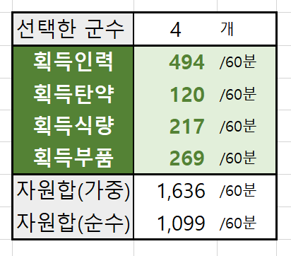 선택한 군수들을 돌릴 경우 예상되는 시간당 자원 획득량이 표시됩니다.