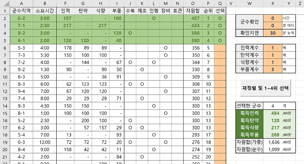상술한 확인시간 및 지연시간, 또는 여기에서 자원계수를 수정할 경우 O열의 자원합과 P열의 순위가 재계산되고, 그 후에 재정렬 버튼을 클릭하시면 재계산된 순위로 재정렬되어 1~4위의 군수가 선택됩니다.