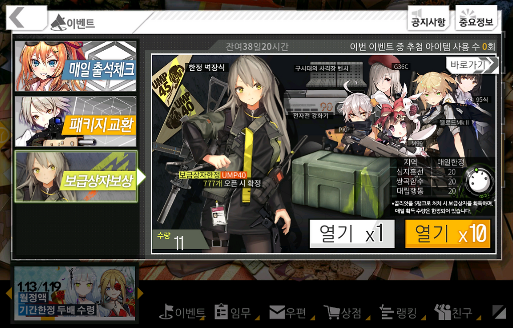 보급상자를 777개 이상 까면 전술인형 ump40을 확정으로 얻으실 수 있습니다.