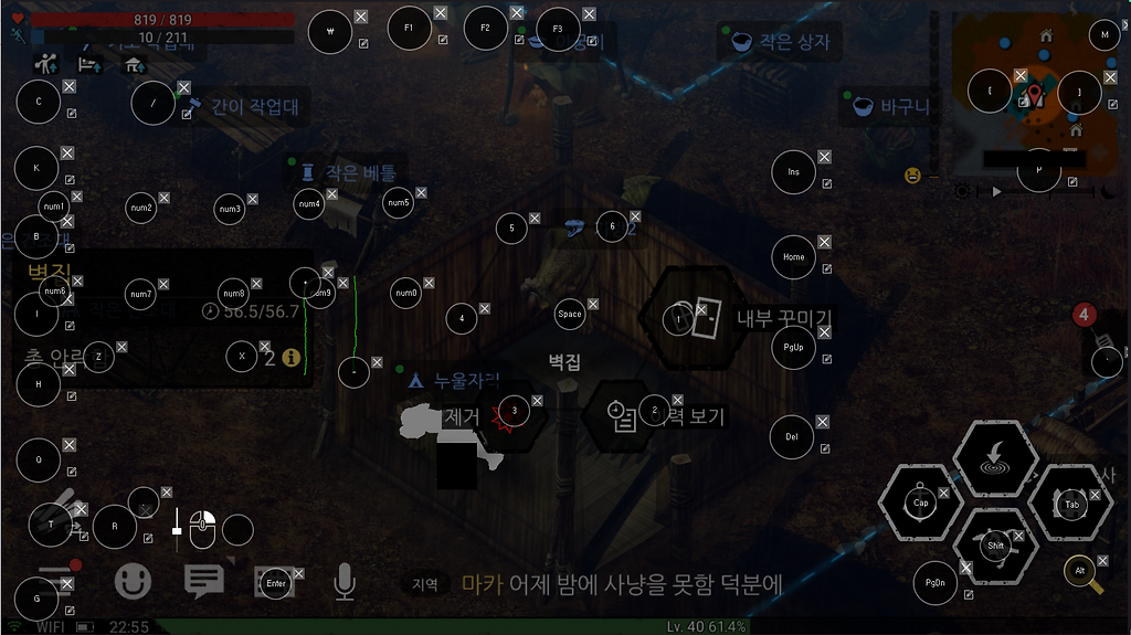 그리고 녹스에서 듀랑고를 키고 컨트롤+1 또는 오른쪽 메뉴에서 가상키를 눌러서 제대로 가상키가 잡혀있는지 확인해 주세요~
