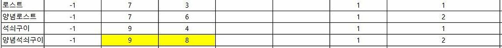 본 사진으로 돌아와서 위 엑셀은 모든 음식에 대한 가공 방법입니다.