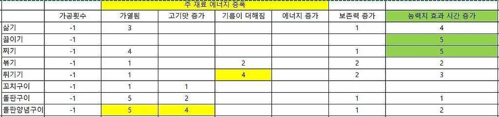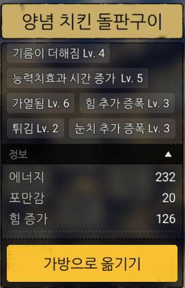 가열됨, 고기맛증가, 기름이 더해짐, 튀김, 에너지증가 =주 재료 에너지 증폭 = 최대 에너지 증가
