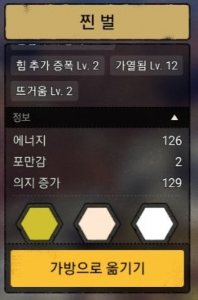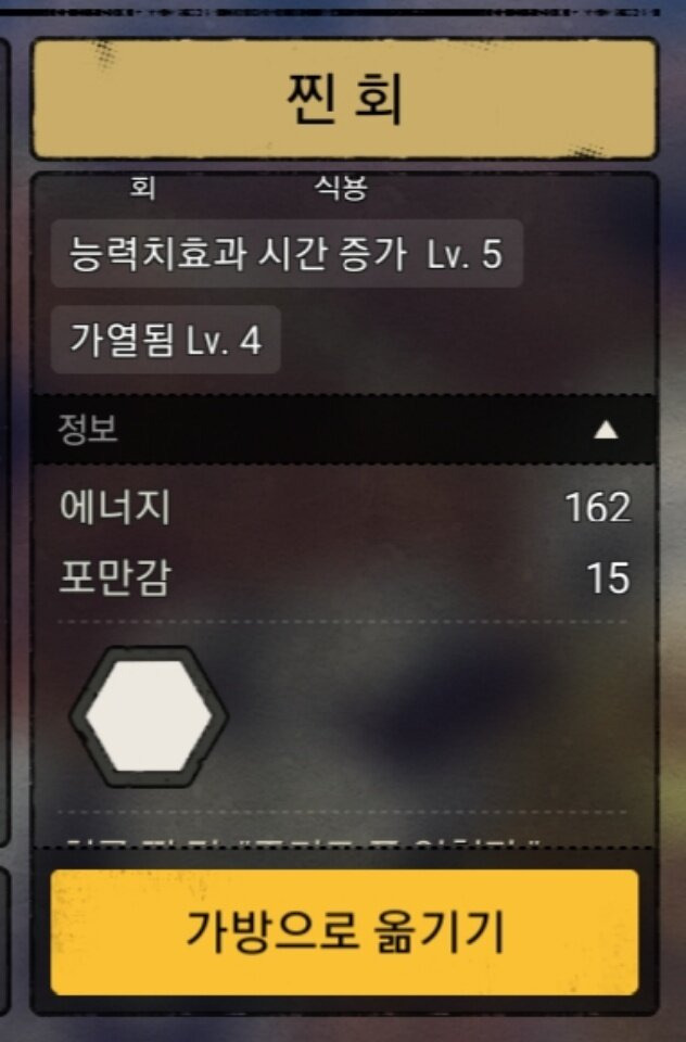 - 설명 : 55레벨 기준 162의 에너지회복을 보여준다. 회찜찜이 좋은 요리라고 평가받는 이유는 첫째 에너지효율이 높으며, 둘째 기존 요리의 버프를 지우지 않기 때문이다.