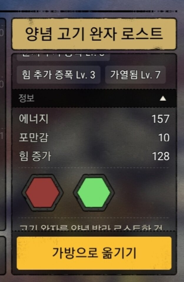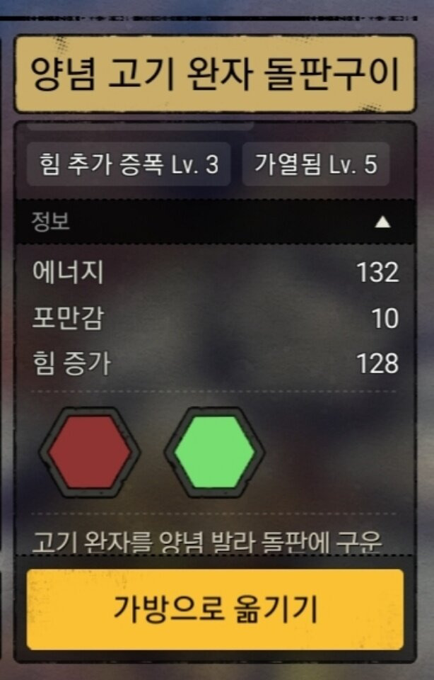 -> 힘증가 요리에 비해 솜씨를 함께 가져감으로서 치명율과 채집능력을 높여준다. 웬만하면 이걸 추천하지만, 부족에 농사꾼이 없다면 힘증가음식으로 갈음하자.