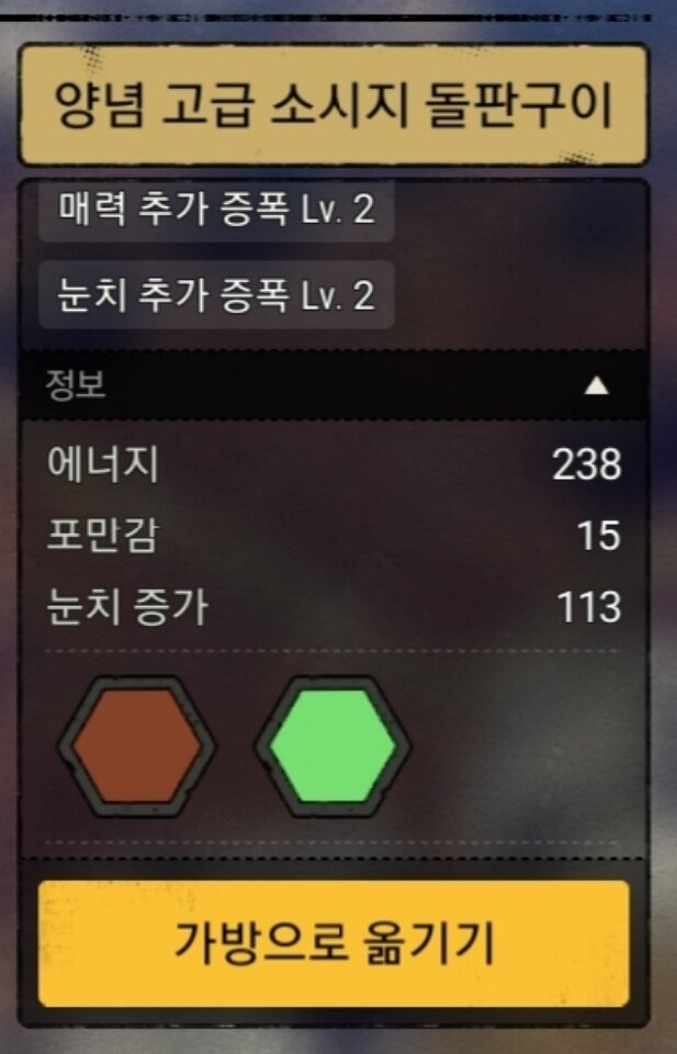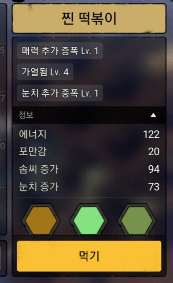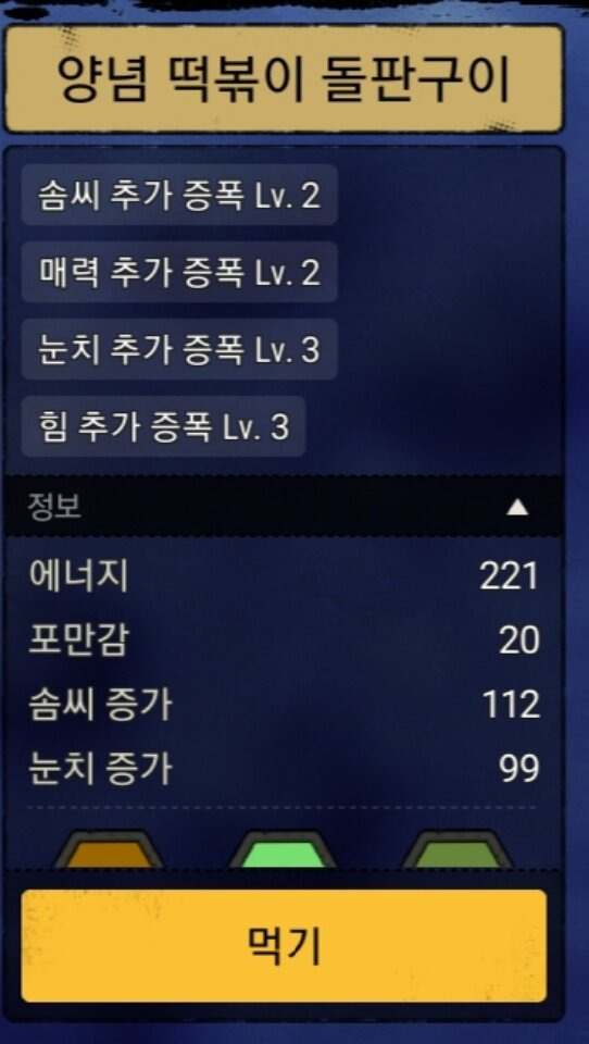 - 설명 : 동렙 눈치를 가장 많이 올려주는 음식. 특히 양념의 눈치 증폭효과가 중첩된다. 대성공 확률을 최대로 끌어올리고 싶다면 사용하자. 그러나 실패나 실수 확률 때문에 솜씨증가를 같이 챙겨가는 떡볶이를 더 추천한다.