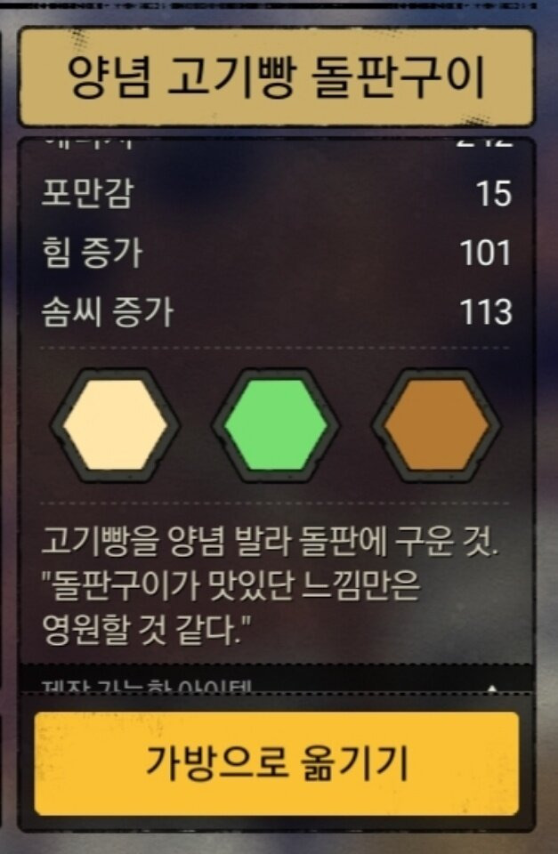 - 설명 : 고기빵에 있는 힘과 솜씨를 양념돌판구이로 최대로 끌어올린 음식. 고기빵으로 만든 후 가공횟수가 1밖에 남지 않으니 힘을 올리고 싶으면 소금을, 솜씨를 올리고 싶으면 설탕을 쓰도록 하자. (개인취향이지만 필자는 설탕을 통한 솜씨증가를 선호한다. 보통 밖에 나가 사냥하는 부족원은 솜씨가 영향을 주는 식물, 광물들도 채집하기 때문이다.)