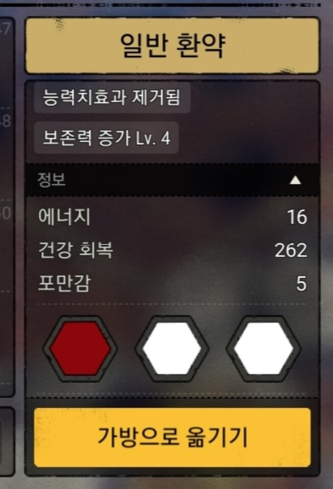 - 설명 : 다소 복잡하긴 하나, 52레벨 기준 건강을 200 넘게 채워주는 포션. 기존에 있는 요리버프도 지우지 않아 효율이 높다. (예를 들어 고기빵(솜씨+힘)을 먹은 후 일반환약을 먹어도 버프가 사라지지 않는다. 이전 음식의 효과가 사라진다는 알림은 가뿐히 무시하자.) 46레벨 이상 토기절구가 필요하기 때문에 진흙 수급과 46레벨 이상 도구 제작자를 요한다. 하지만 건강회복 효율이 정말 좋으며 배부름도 5초가 채 되지 않아 연속으로 먹을 수 있다. (보급용 진통제 먹다가 이거 먹으면 신세계를 느낄 수 있다.) 광산이나 워프유적 주변 몹들에게 피가 많이 까였을 시 먹어두면 좋다.