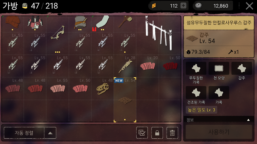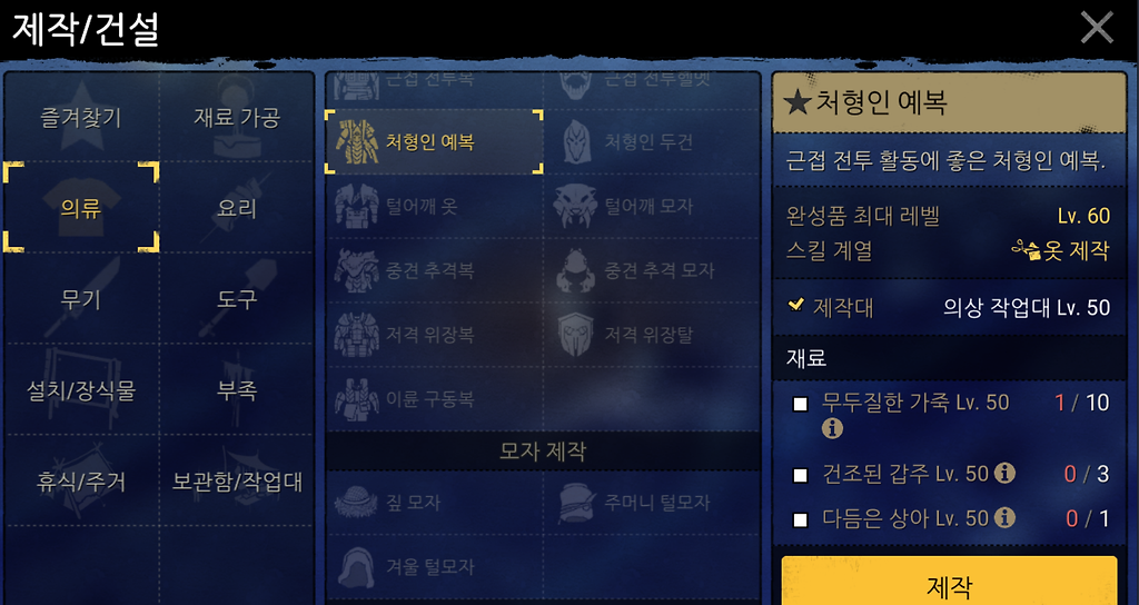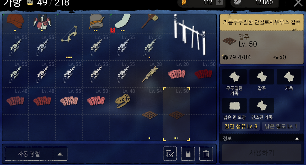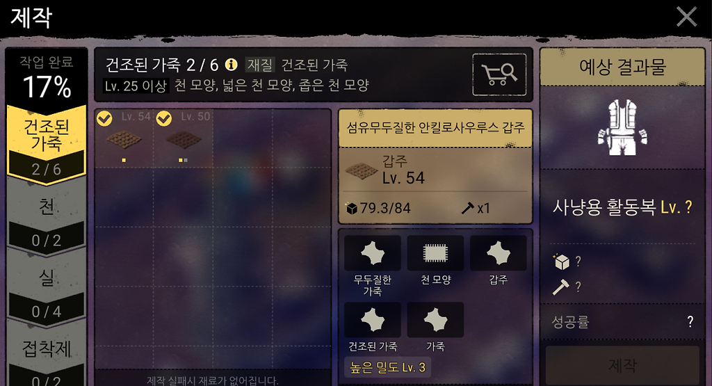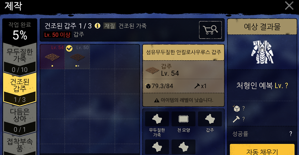 50레벨 건조-기름-건조 한 갑주가 50레벨 이상 무두질한가죽 속성에