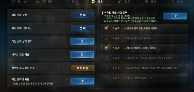 2. 이렇게 설정하고 게임상 왼쪽 아래에 있는 버추얼패드 (아래 동그란 버튼)을 누르면 저절로 대상이 선택되는데