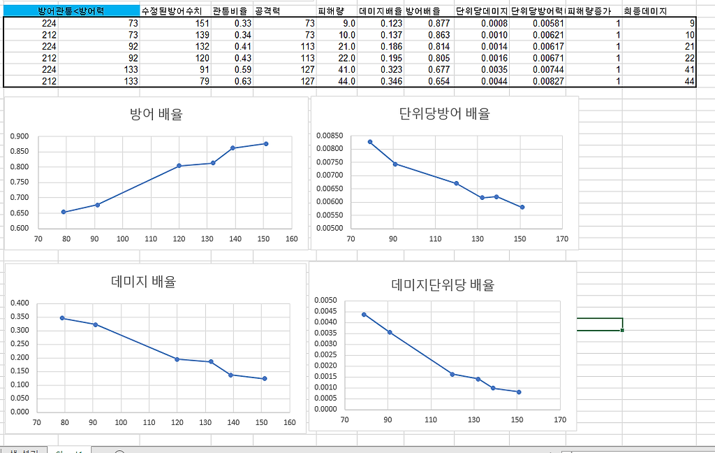 방어력이 증가할수록 데미지배율은 적어지고 단위당 데미지배율도 적어지게됩니다. (데미지배율은증가 단위당배율은감소)=>1번실험결과와 동일한결과를 얻을수있습니다.