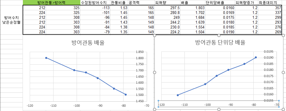 # 방어관통이 낮을수록 방어력이 증가하여 데미지는 감소하나 단위당방어력배율은 감소하여 감소폭이 둔화될것으로 보입니다.