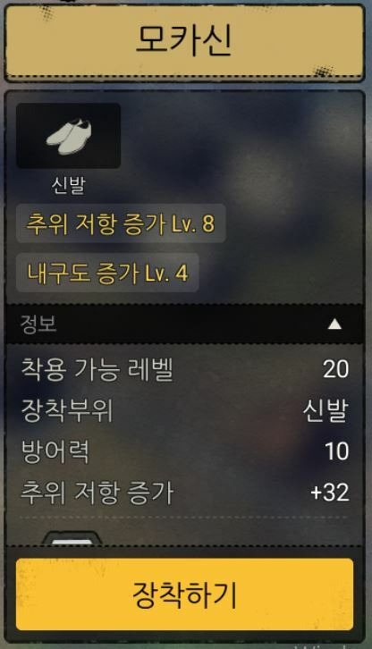 B값을 설명하기에 앞서 위 모카신의 수치를 보면 추위저항증가 레벨(Lv.)이 8인데요.