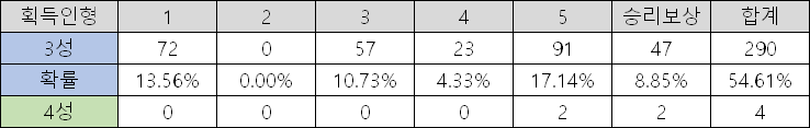 531번이 솔직히 말하자면 모확률을 추정하기에는 턱없이 낮은 횟수입니다만 일단 무언가가 있다는건 알았습니다.