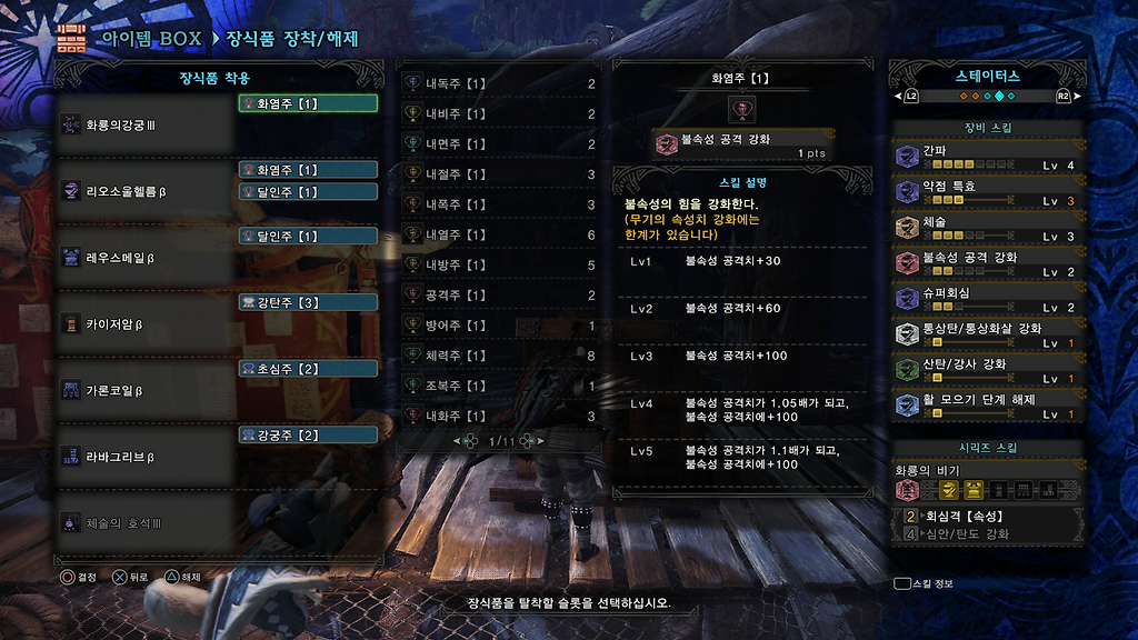 화염주는 두 셋팅 전부 2개씩만 박습니다, 쟈나프의 경우 더 박을수 있지만 회심이 내려갑니다.