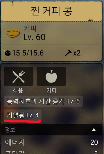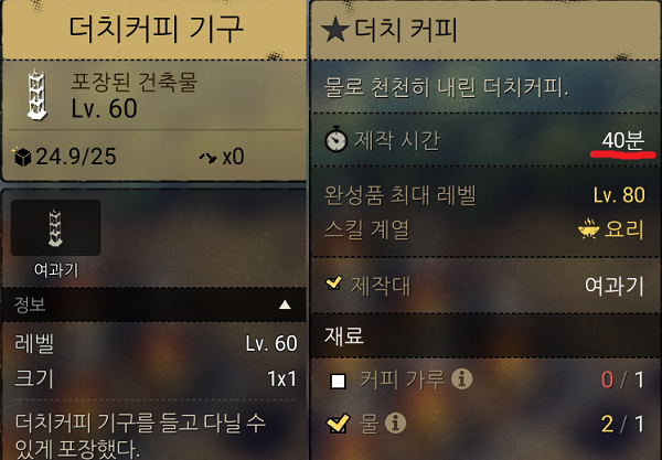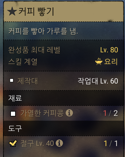커피를 만들기 위해선 [가열한 커피콩]이 2개와 60레벨의 작업대(기술 작업대) 와 40레벨 이상의 절구가 필요한데,