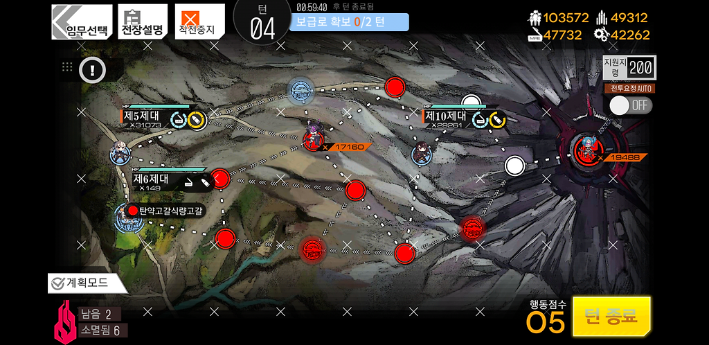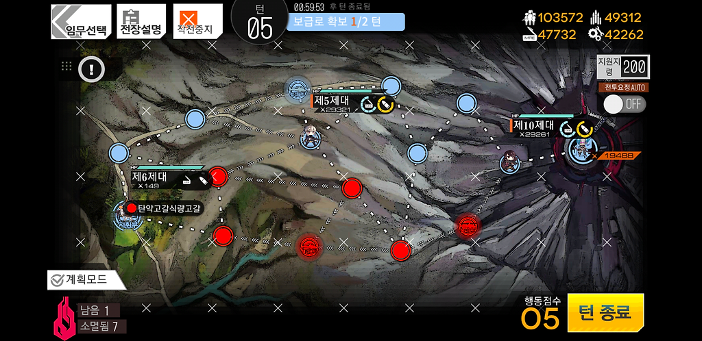 5턴 깔끔하게 보급로를 확보하고 저쪽에 있는 철혈은 움직이지 않기 때문에 아무걱정 없어도 됩니다.