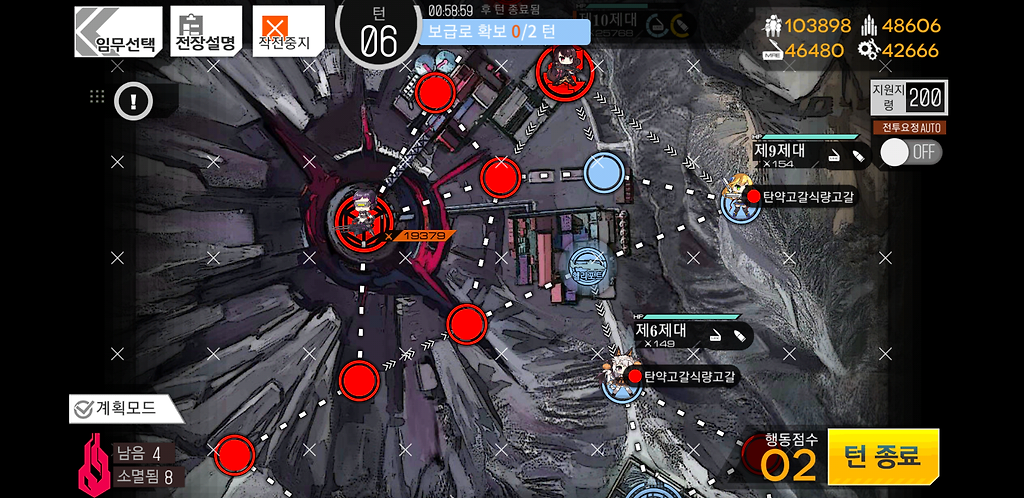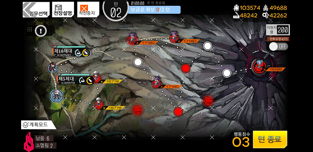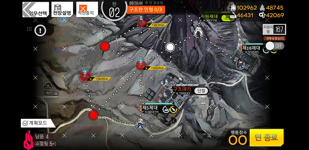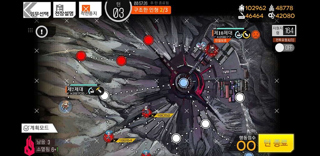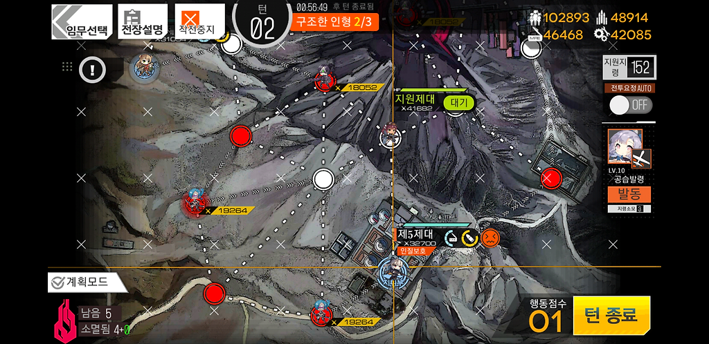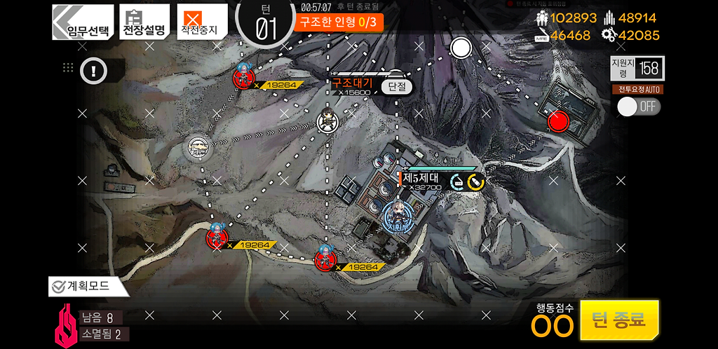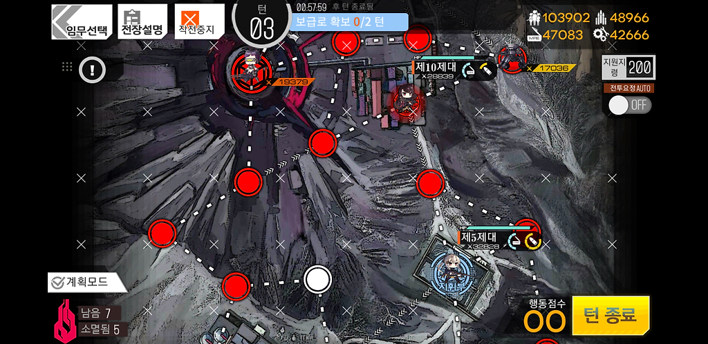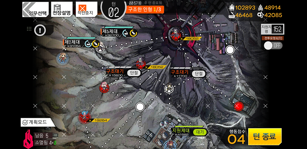 3턴 주력제대를 우측으로 2칸 지휘부에 있는 제대를 위로1칸 그리고 더미를 소환합니다. 더미를 소환하는 이유는 저 맵에 있는 가드가 아래로 내려올 수 있기 때문에 교대를 위해 소환한 것입니다.