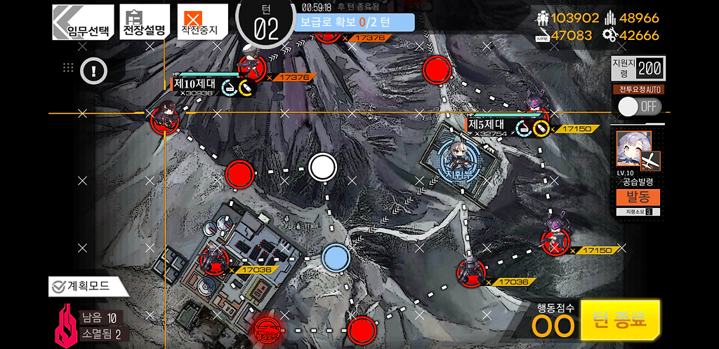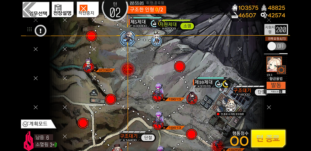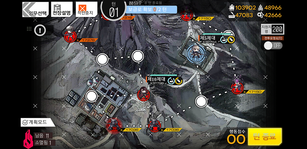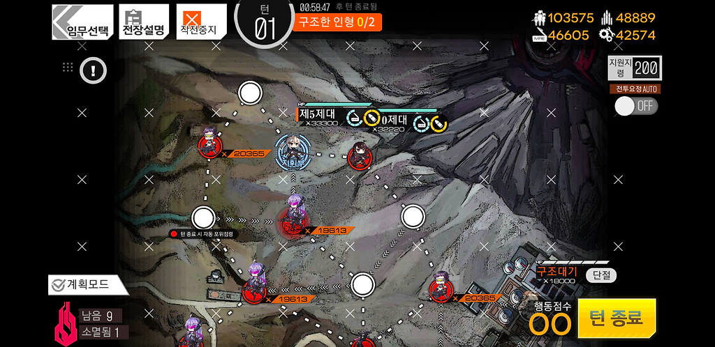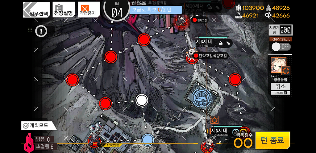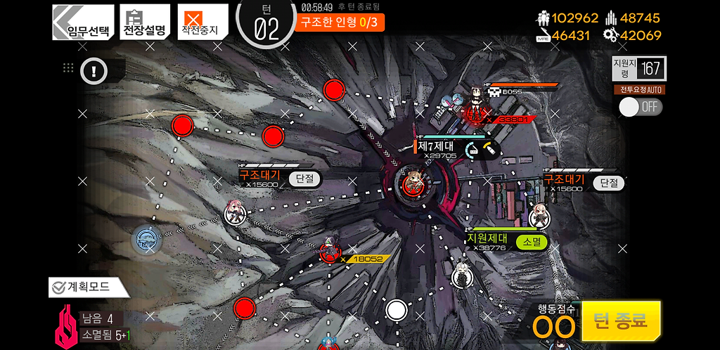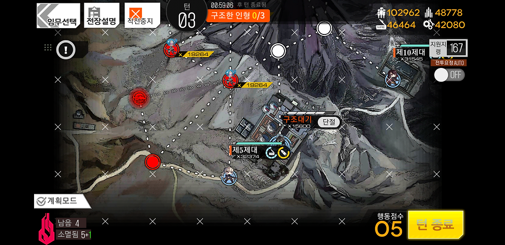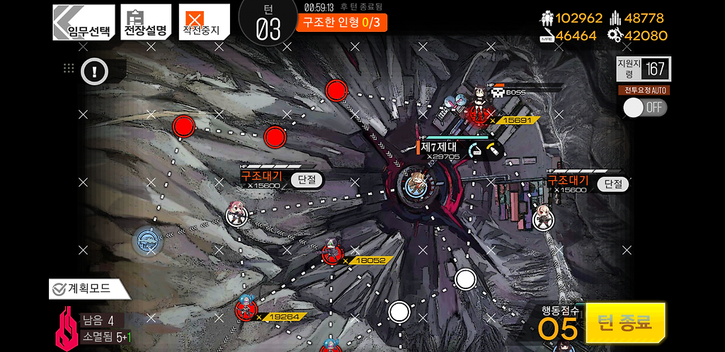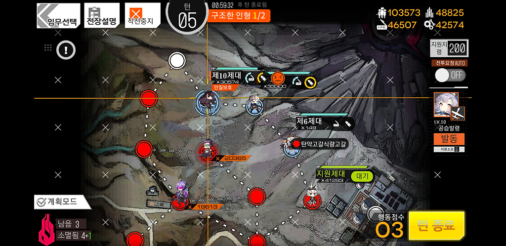 3턴 주력제대를 우측으로 2칸 지휘부에 있는 제대를 위로1칸 그리고 더미를 소환합니다. 더미를 소환하는 이유는 저 맵에 있는 가드가 아래로 내려올 수 있기 때문에 교대를 위해 소환한 것입니다.