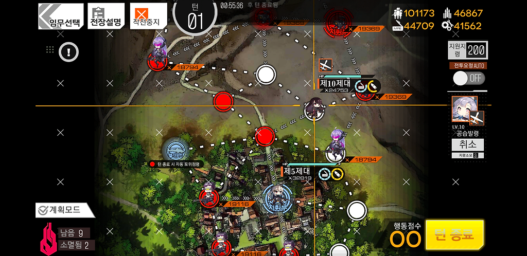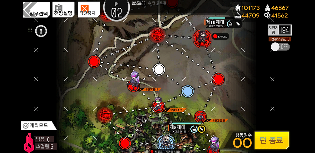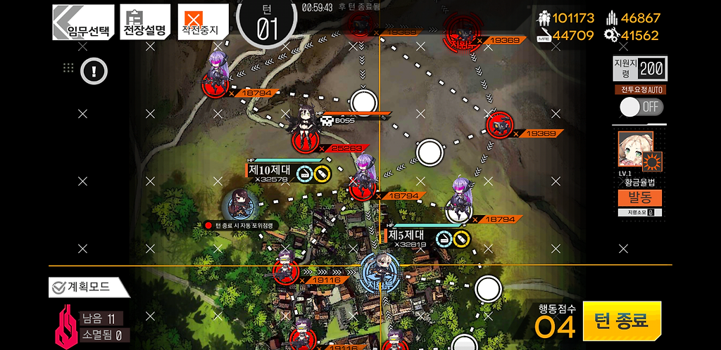 2턴 주력제대를 몹이 있는 방향으로 해서 위로 3칸을 올린다. 이때 눈치것 지휘부가 거점점령 안되게 움직이는일것