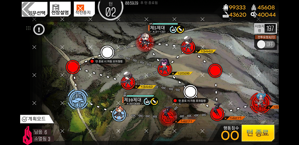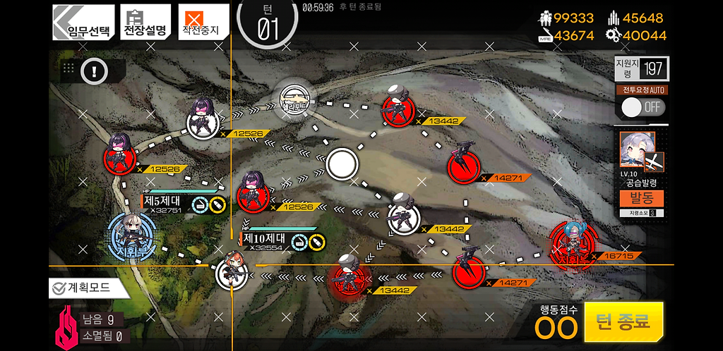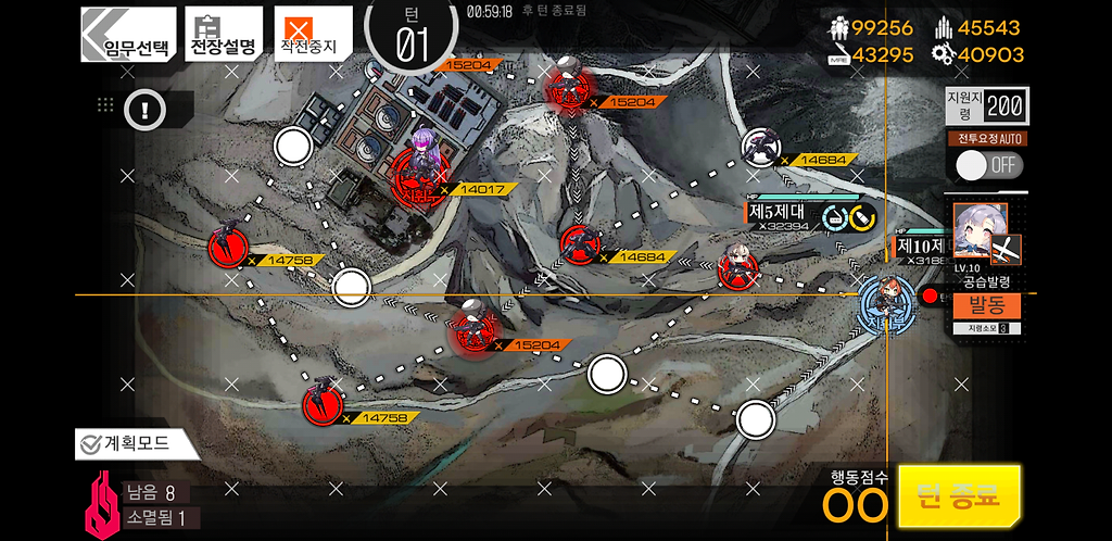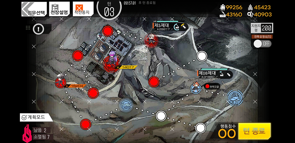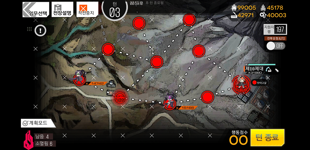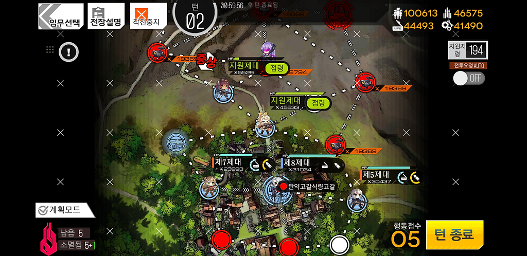 1턴 앞에있는 철혈을 처리하고 지휘부를 지킬제대 배치 지휘부쪽은 안싸울 수도 있으니 더미소환해도 상관없음
