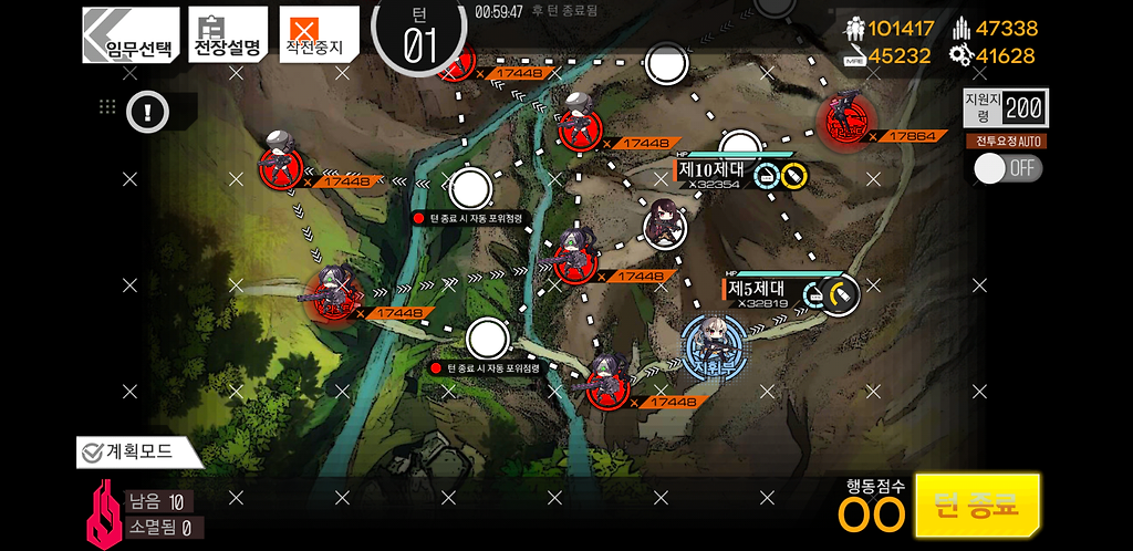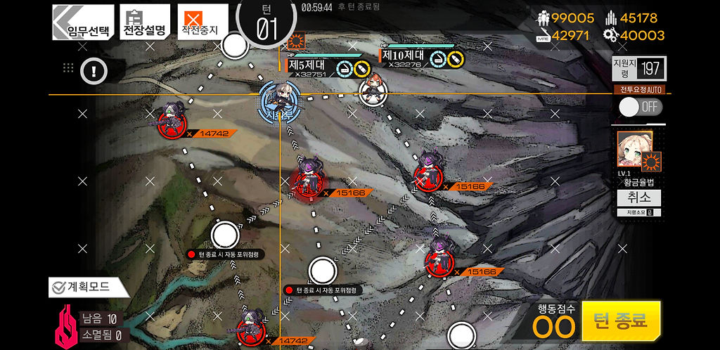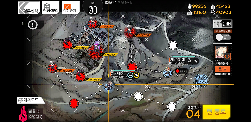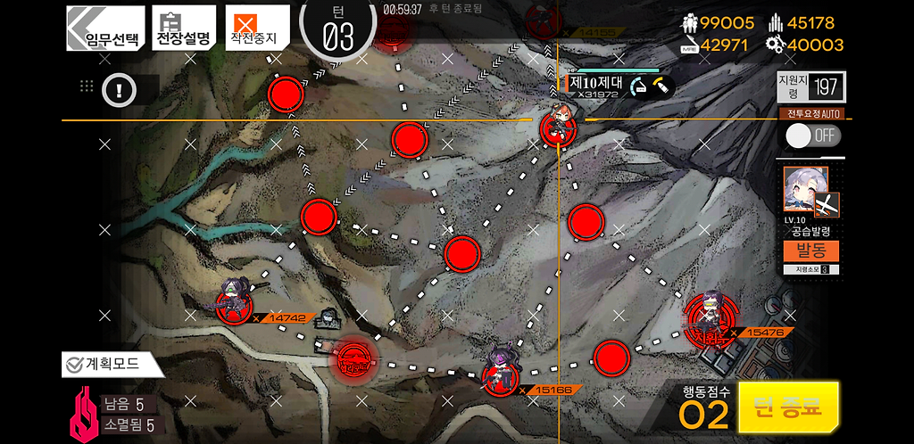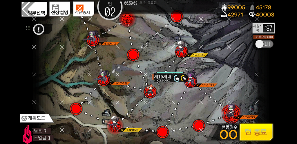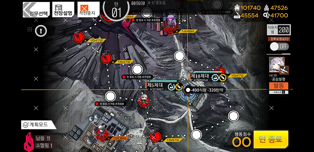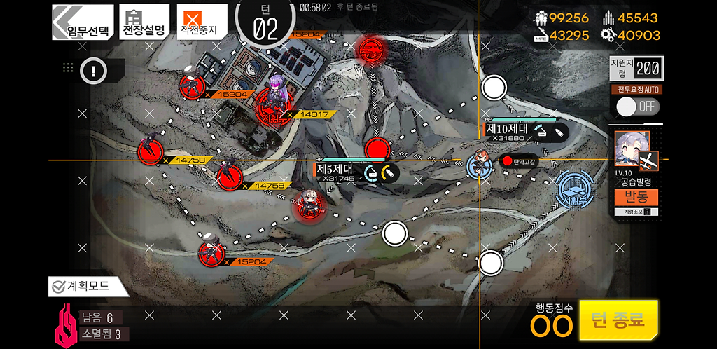 1턴 앞에있는 철혈을 처리하고 지휘부를 지킬제대 배치 지휘부쪽은 안싸울 수도 있으니 더미소환해도 상관없음