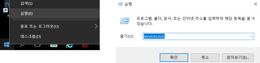 1. 바탕화면 좌측 하단에 윈도우 아이콘 우클릭 후에 실행을 누릅니다.