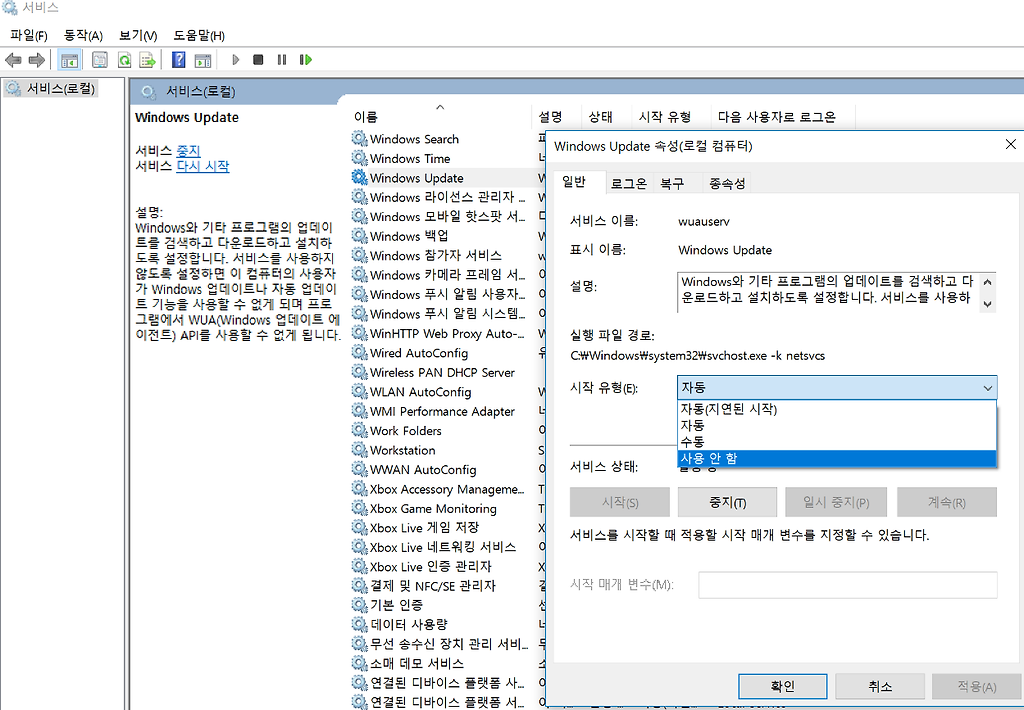 4. 시작 유형은 사용 안함으로 바꿔주고 서비스 상태는 중지를 클릭한 후에 적용 확인을 눌러줍니다.