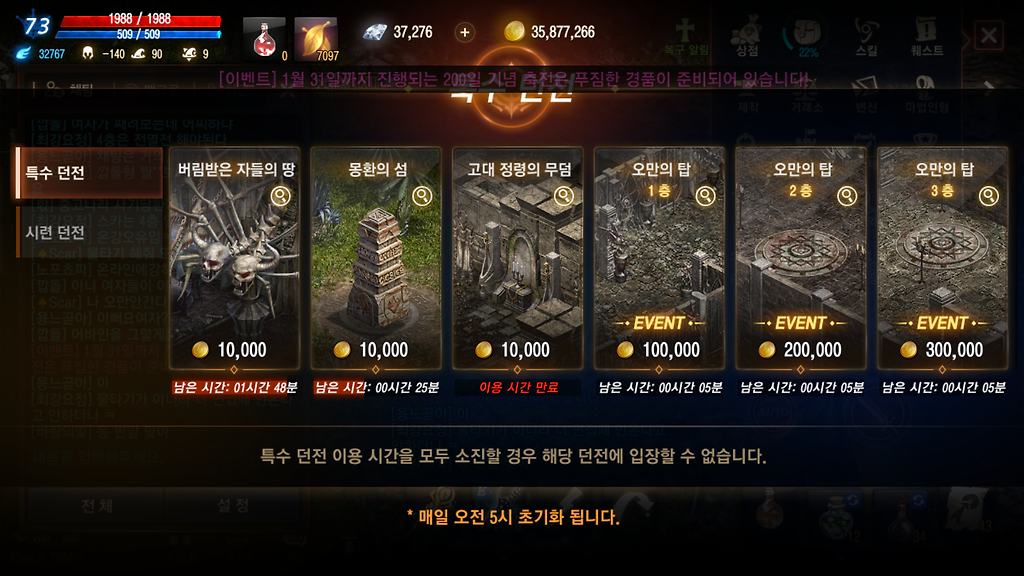 애매하게 저 위 던전들이 5시 초기화 된다고 되어 있어서 7시간이 매일 초기화 되는지 전화해봤습니다.