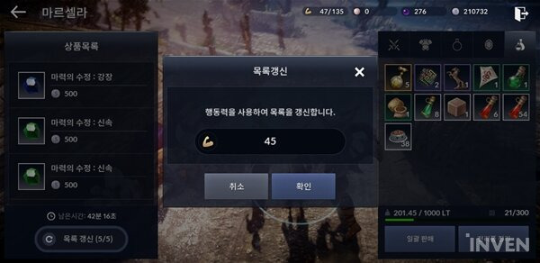 상품은 1시간 단위로 갱신됩니다. (갱신 주기는 상인별 별도 적용, 행동력 사용 시 즉시 갱신 5번 가능)