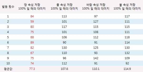 땅 속성 저항 100%일 경우 다른 속성에 비해 대미지가 약 30% 정도 낮게 나오는 것을 확인할 수 있다. 따라서 베놈 블레이즈는 땅 속성 공격이라는 것을 유추해볼 수 있다.