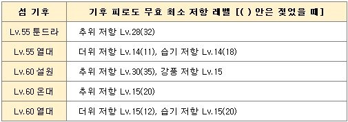 온대 무법섬에서 기후 효과를 무시하기 위해서는 추위 저항 20레벨을,