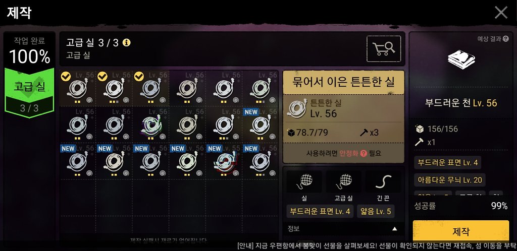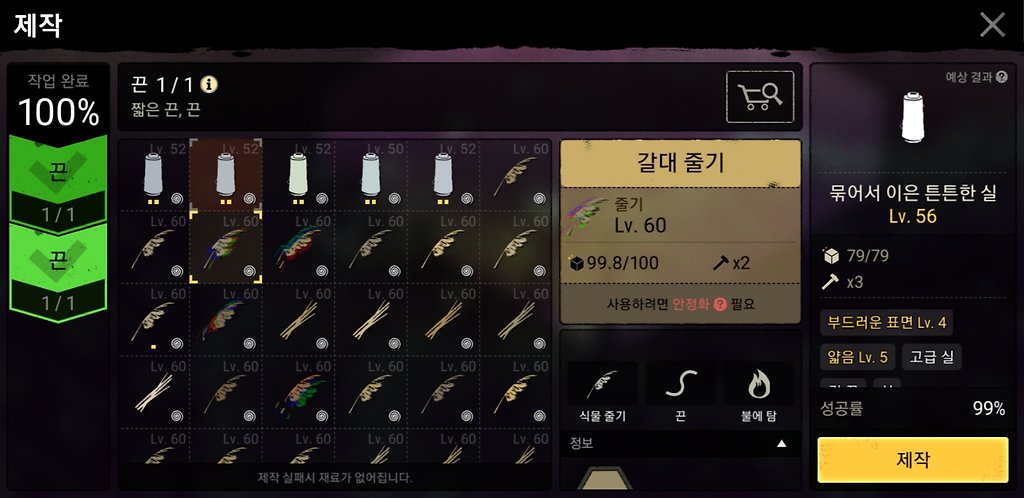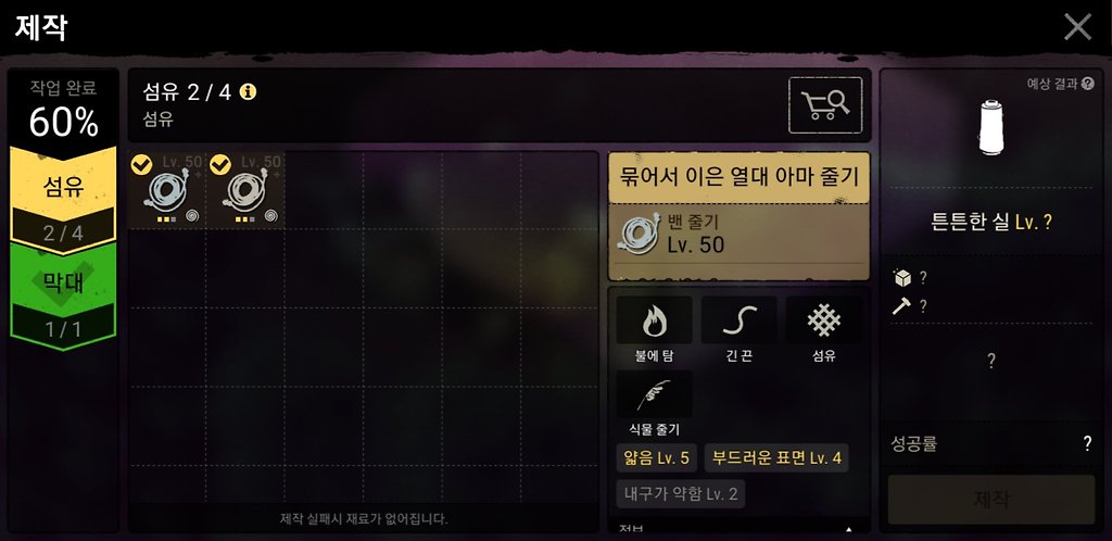 2.50열대아마 끈 4개와 60나뭇가지를 넣고 실을 짤 경우 52튼튼실이 나옵니다