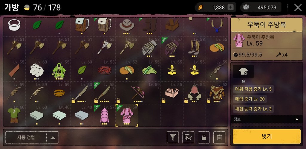 남는? 탄력(채집)천은 대충 주방복으로 떼웠내요(이와중에 순서 3번 뻘짓으로 인한 렙다와 제작 삑사리로인한 채집 1감소... ㅂㄷㅂㄷ)