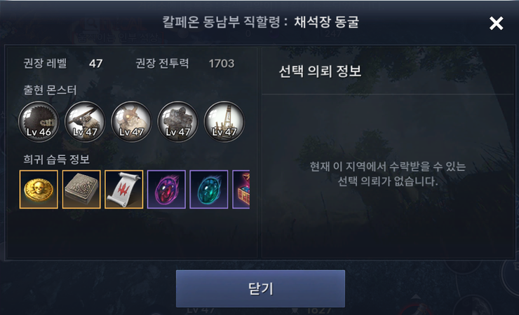 (2) 지역창에 있는 선택 의뢰정보에서 확인 가능하며. 몹을 1200~1600 마리 잡으면 파란색 검은기운 1개 입수 가능합니다.