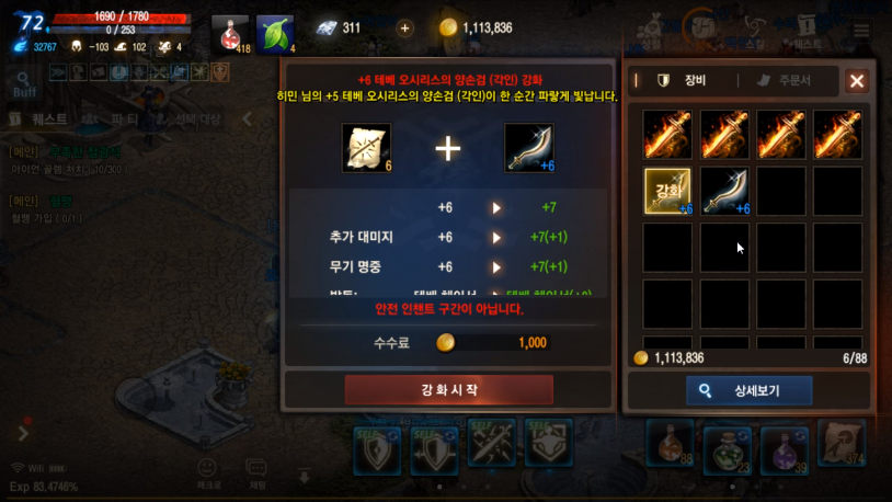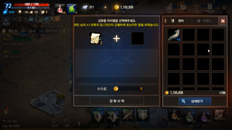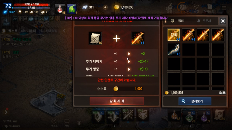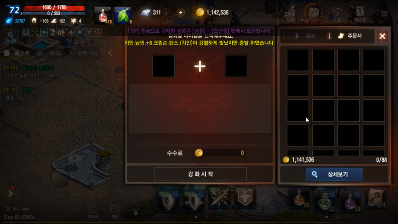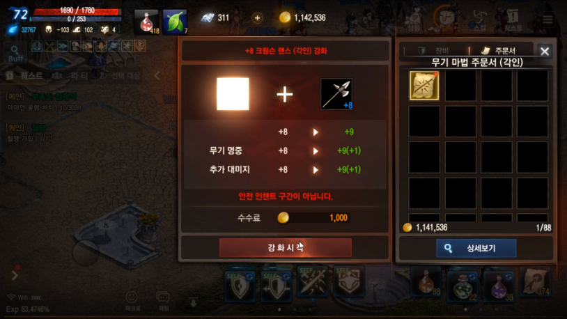 이런식으로 사냥을 하며 장비 강화 주문서 상자를 구매하지 않고