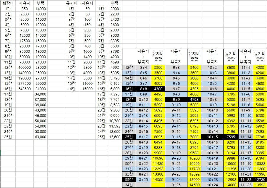 33칸까지는 사유지 10 + 부족23칸이 유지비 대비 효율이 가장좋네요