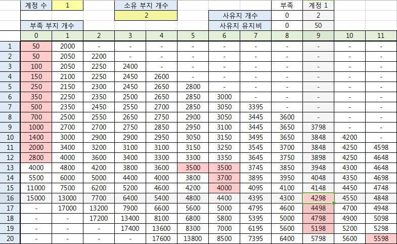 예를들면 1계정에 16개의 부지를 소유할 때 최소값은 부족 부지를 9개 가질 때 유지비 4298이라는 걸 알 수 있습니다