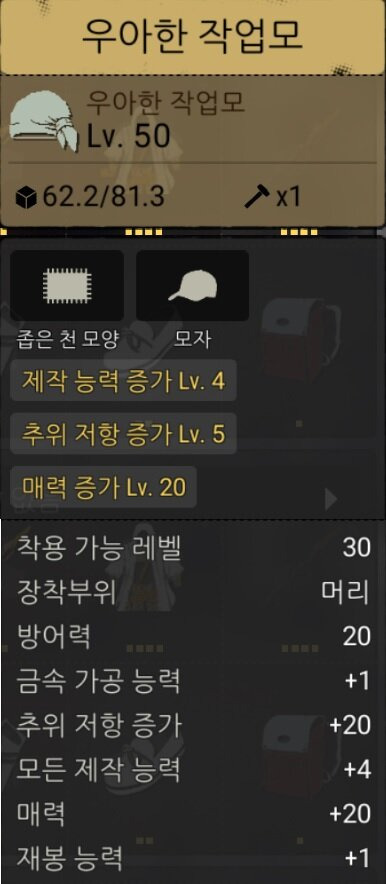 주재료를 채집시 부드러운표면이 붙어 있는 옵션으로 쓰셔야 완제품에서 제작능력증가(모자, 옷)가 추가됩니다