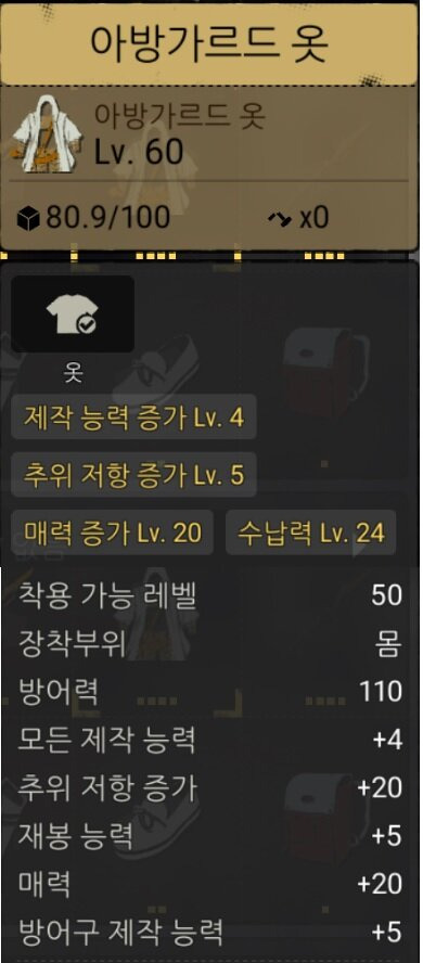 2. 아방가르드 옷 ( 완성품최대레벨 : 60 / 추천재료레벨 : 60 )