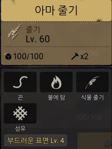 솜(144) 나뭇가지(42) 가죽(9) 아마(24) 진액(4) 큰뼈(4) 이빨(3)