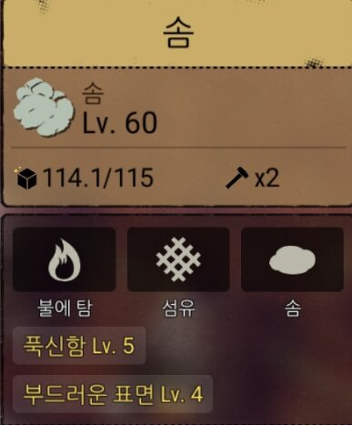주재료(솜 : 푹신함 Lv5) -> 완제품(추위저항증가 Lv5)