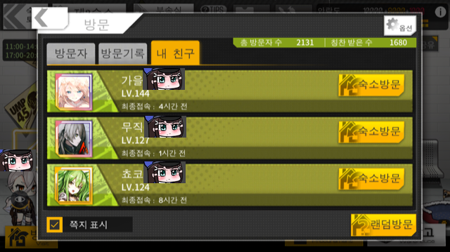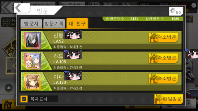 소전앱을 껏다 키면 친구숙소 릴레이할 때 친구추가한 순서대로 감
