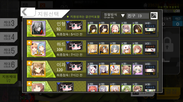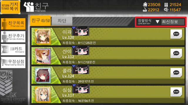 4. 소녀전선 앱을 껏다 켰을시 [정렬방식]은 [친추순서]로 맞춰짐 (리카시즈님 제보. 쉐쉐.)