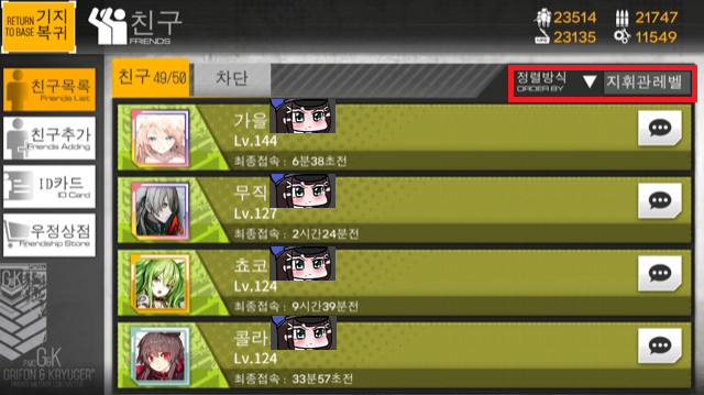 [메인매뉴]-[친구]-[친구목록] 화면에서 [정렬방식]을 [지휘관레벨]로 바꿧습니다.