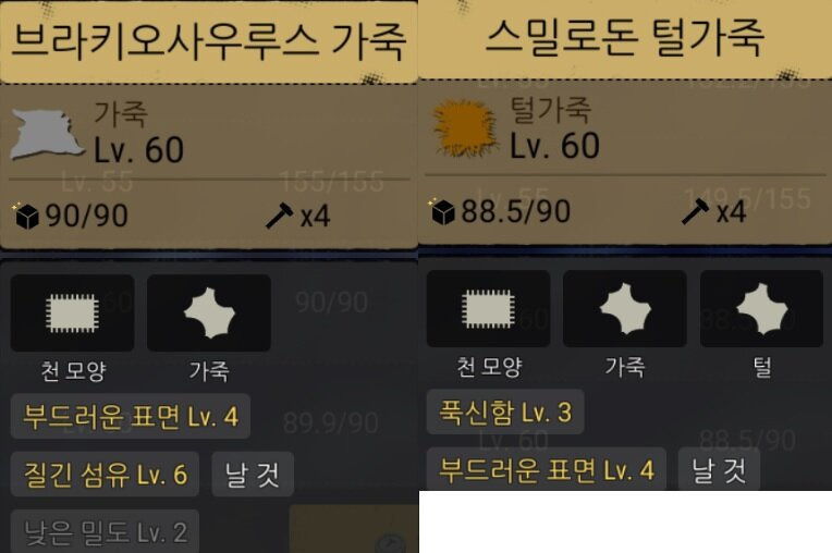 기본가죽(기후영향X), 수컷메갈털가죽or스밀로돈가죽(푹신함 - 추위저항), 유타랍토르가죽(얇음 - 더위저항)
