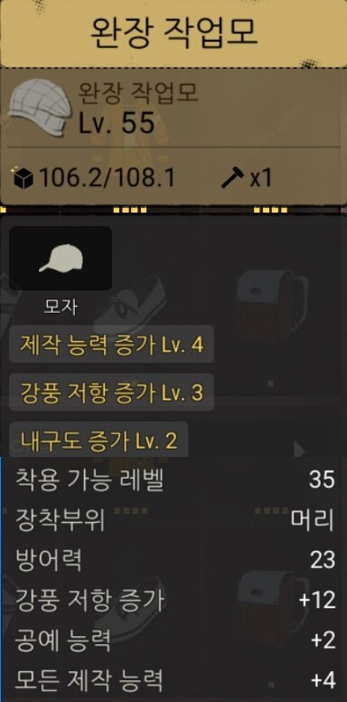 1. 완장 작업모 ( 완성품최대레벨 : 55 / 추천재료레벨 : 55 이상 )